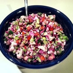 Red cabbage, cauliflower, and bell peppers are tossed with feta cheese and olives in a vinaigrette dressing for this addictive Greek-inspired salad.